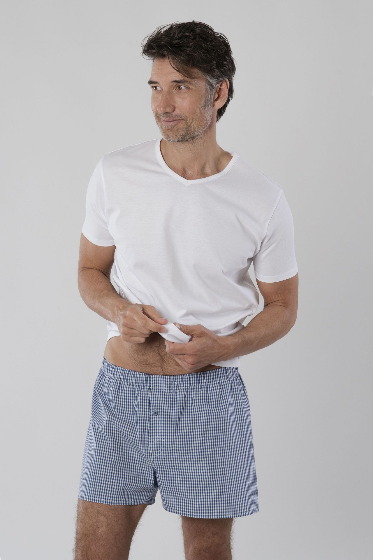 Bequeme Boxershorts Bio für Herren im 2er Pack. Aus Bio Baumwolle. Die Shorts sind schlicht und elegant. Sie haben einen Engriff mit einer dezenten Knopfleiste und einen bequemen Bund. Im 2er Pack befindet sich eine klassich gestreifte und eine dezent karierte Shorts.